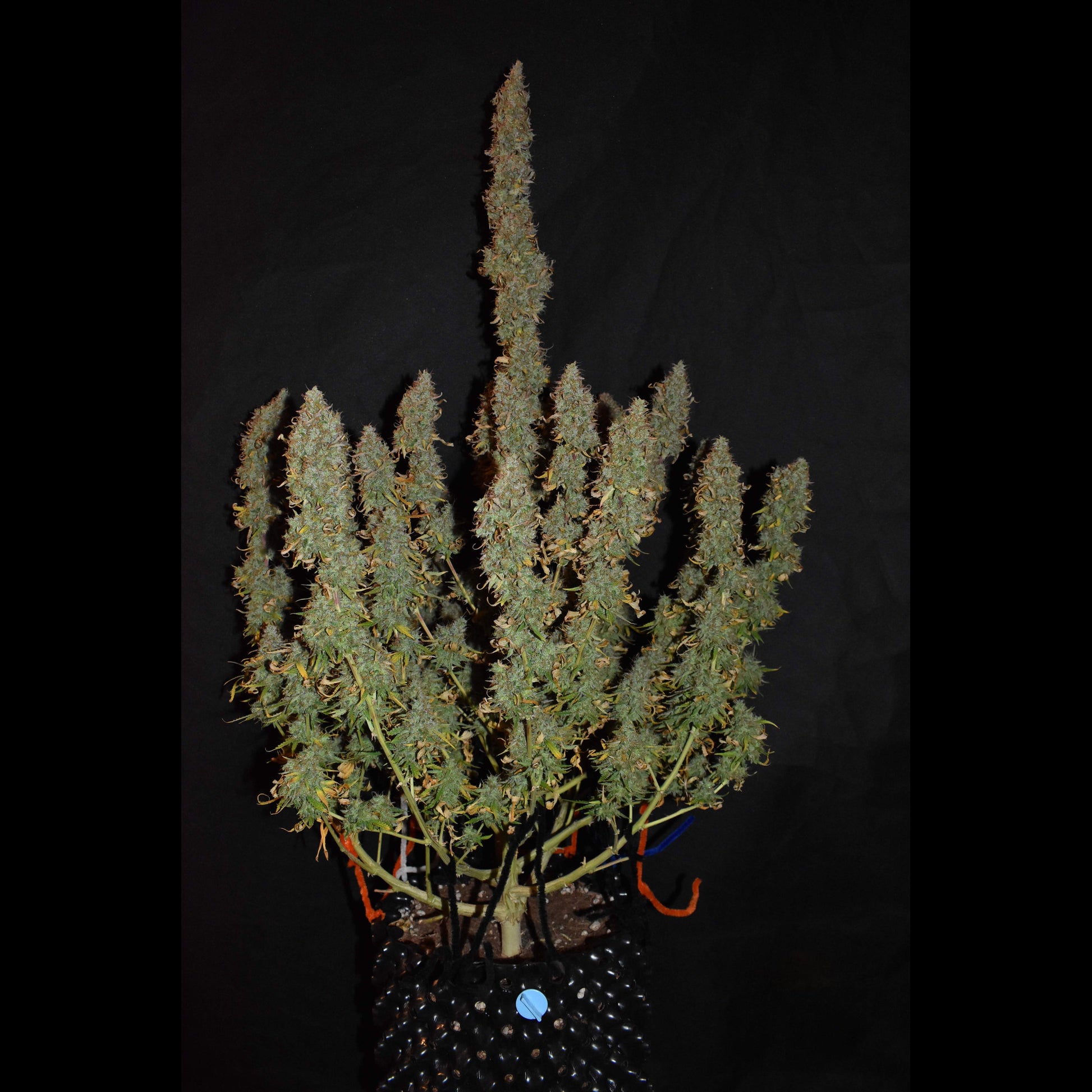She will grow low with short internodal spacing, and short and fat fan leaves. The height will range between 60-100cm once fully flowered, and during this time will produce a large number of fat, golf ball-sized buds. Thanks to her Indica influence, the plants will take on a bushy Christmas tree structure that will surround the lower plants with side branches and foliage. She is perfect for keeping low, and those with concerns overhead height. Her main stem will be thick and she will be extremely wind-resistant, due to her low and bushy structure. She will begin to turn white with an intense build-up of trichomes and produce resin rails all over the fan leaves and surrounding plant material.Grow Tips