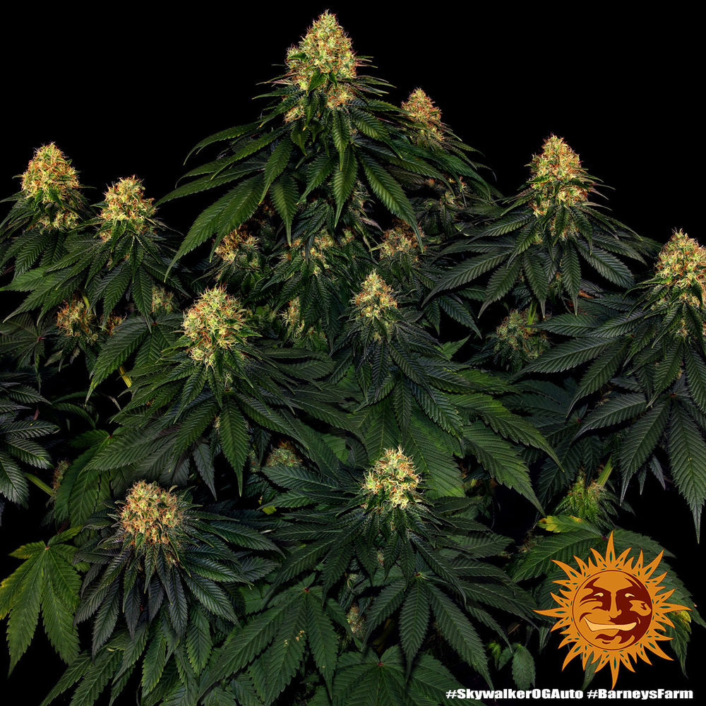 Skywalker OG Autoflower literally explodes into a pine flavoured christmas tree in a mere 70-75 days from seed, producing an abundance of glorious kushy flowers dripping with glistening THC crystals. Expect a final height of up to 120cm outdoors or 100cm indoors. Experience the thrill of killer US genetics ‘Skywalker OG’ expertly wrapped up into a juicy astonishing autoflowering package of 24% THC by the team at Barneys Farm.